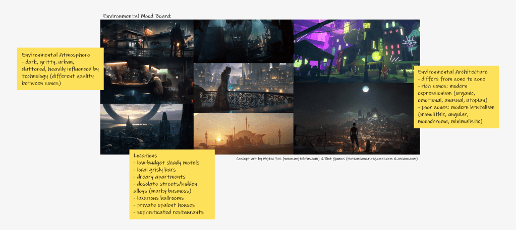 Since Caidan and Rheyn live on different ends of the city, the majority of the gameplay will be set in a variety of deformed areas exposed to very little lighting to achieve that gritty atmosphere of the game world. In some chapters, they will be able to visit the city centre, so the architecture will change from modern brutalism to modern expressionism.
