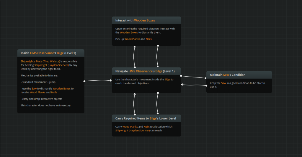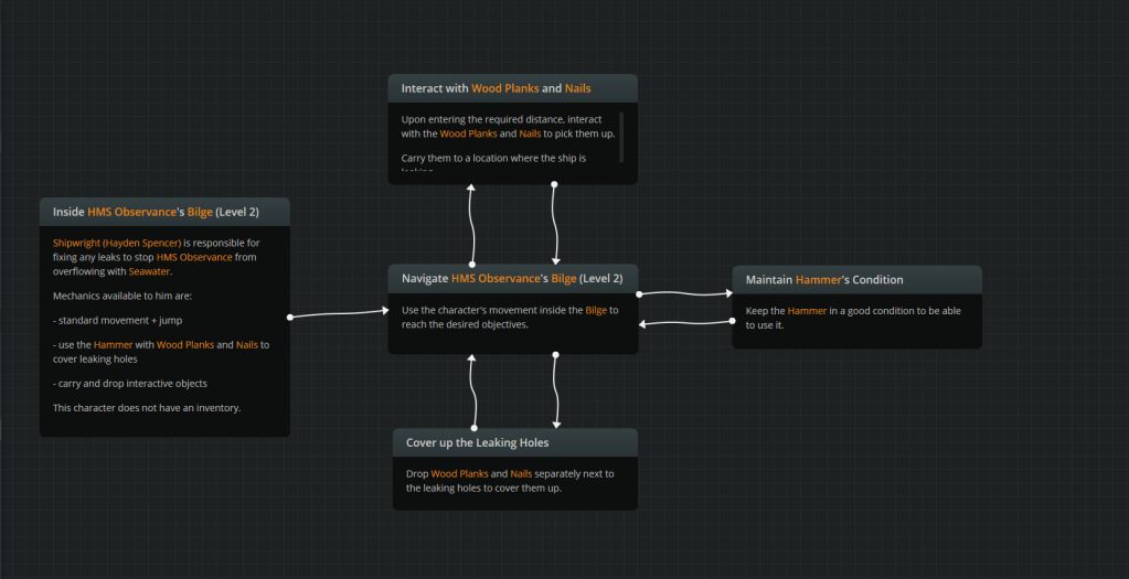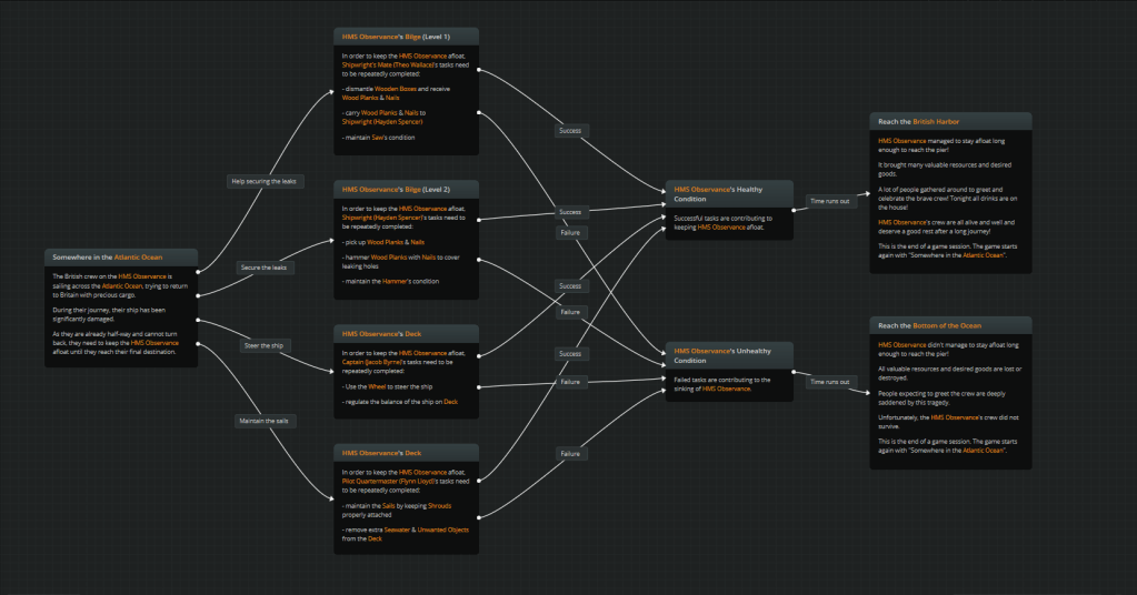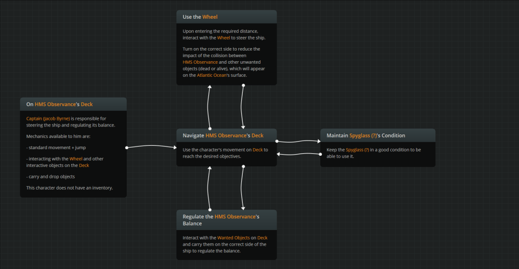 During the first week of production, we decided to use Arcweave, an online data base which allowed us to easily create, collaborate and share our design documents. Below you can see how we designed our main gameplay loop.