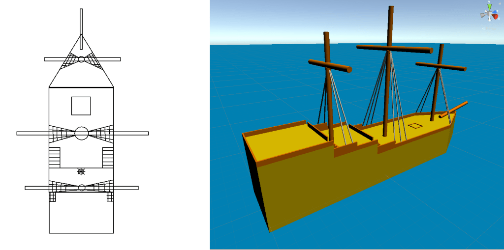 To replicate the ship, we first started making a top-down map. Our initial idea was to have two gameplay areas, the ship’s deck and bilge which is the lowest part inside the ship, where the first signs of leakage would show if the ship was damaged. Below, you can see our first top-down level layout and the prototype made in Unity using ProBuilder.