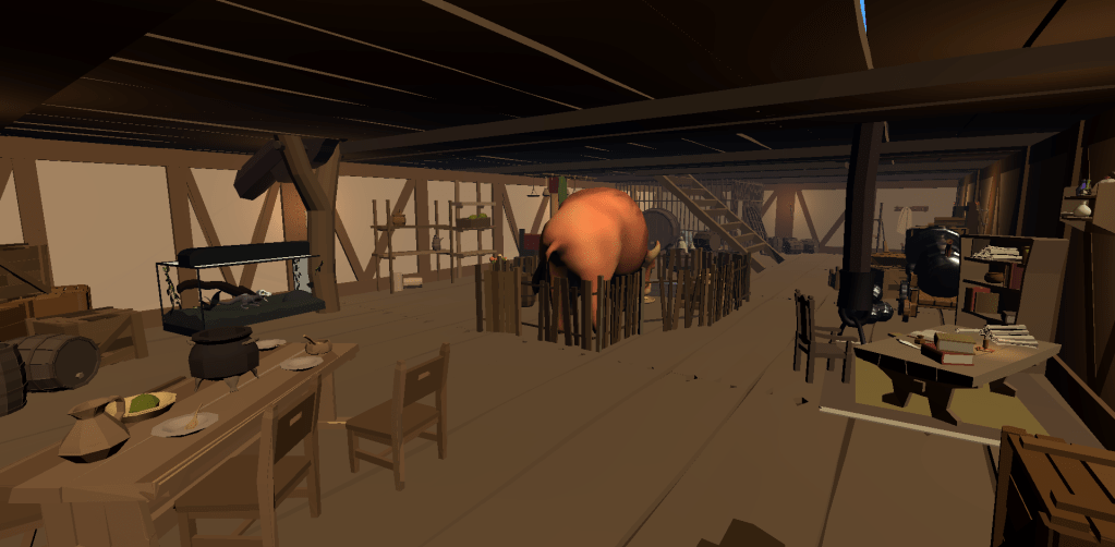 At early stages, we also decided upon having stylized, colourful and cartoon-like graphical style filled with low poly assets because we would improve game’s performance with low-complexed model, and would have an easier time to find desired assets. Additionally, this art style helped us achieve our targeted atmosphere and humorous narrative.