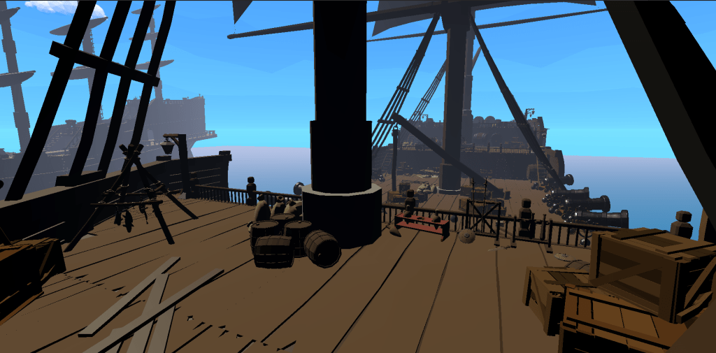Once we completed our level prototype and used a first-person controller to test the scale of the environment and adjusted the size of our ship, we searched for royalty-free assets on websites like Itch.io, Unity Asset Store, and Sketchfab. Once we found what we looked for, we were ready to use our world building skills to create our desired atmosphere and gameplay areas. Below, you can see a set of screenshots which showcase the final look of our ship (the deck as our primary, and the bilge as our secondary gameplay area).