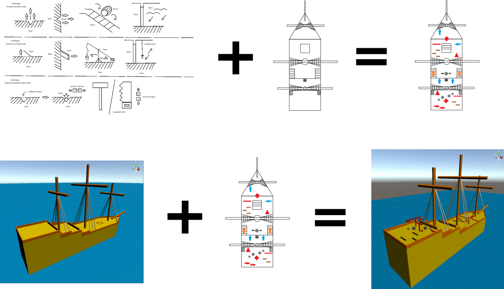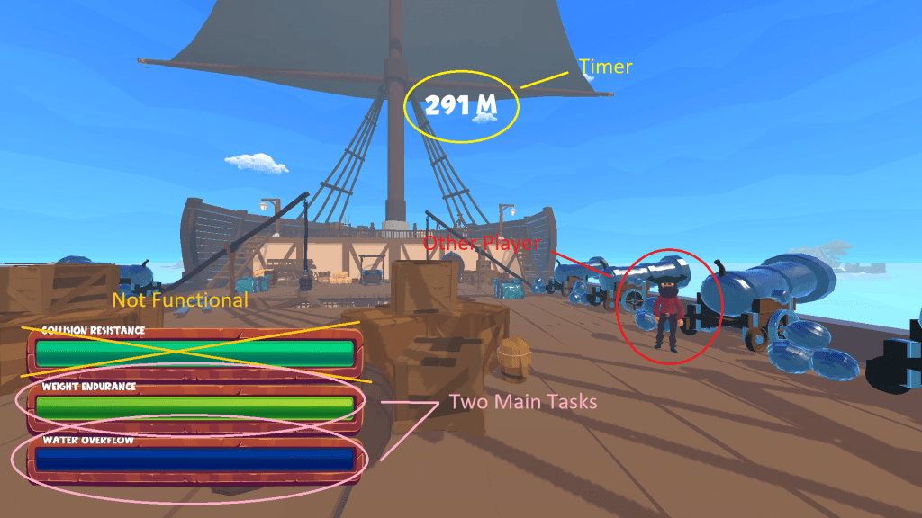 To further elaborate, we can take Player 1 who would play as a captain and Player 2 who would play as a pilot quartermaster. The captain was responsible for steering the ship and regulating its balance, while the pilot quartermaster was responsible for maintaining the sails and removing all unwanted objects from the ship. They were both placed on the ship’s deck and had specific items in their inventory – a spyglass and a bucket, which would help them with their individual tasks. These tasks and items were naturally subject to change. Additionally, we also designed individual player gameplay loops which you can see below.
