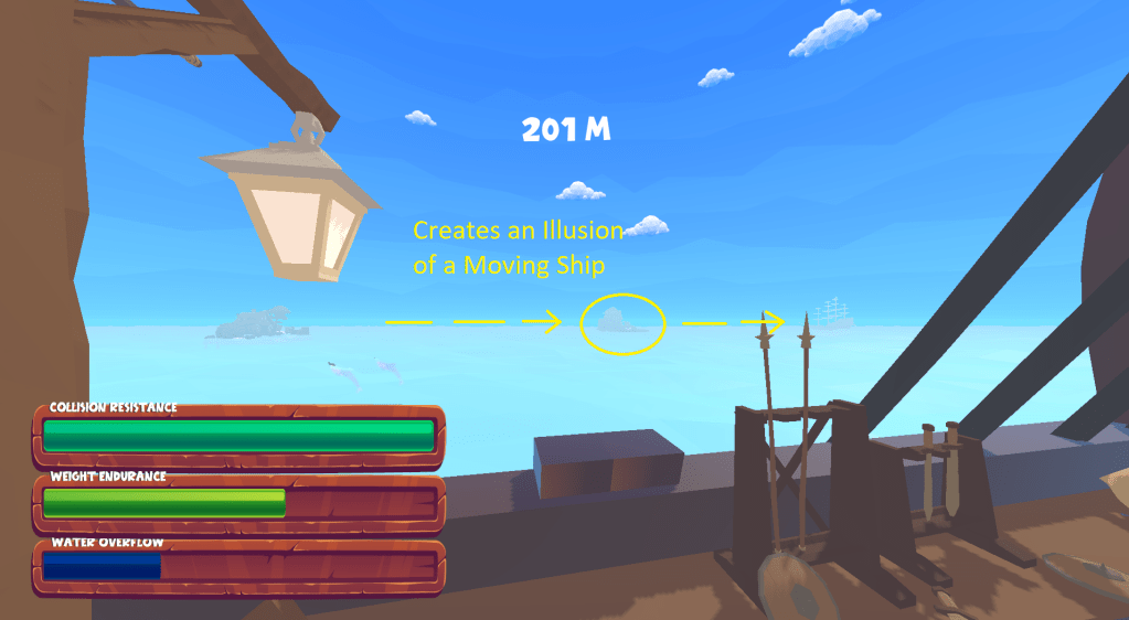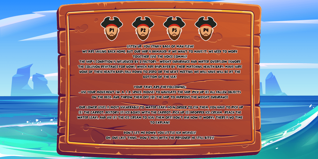 Afterwards, we came up with the game story which followed the British crew that consisted of four sailors on the galleon called HMS Observance in mid-18th century. They were sailing across the Atlantic Ocean, trying to return to Britain with precious cargo. During their journey, their ship has been significantly damaged. As they were already half-way and could not turn back, they needed to keep their ship afloat until they reached their final destination.